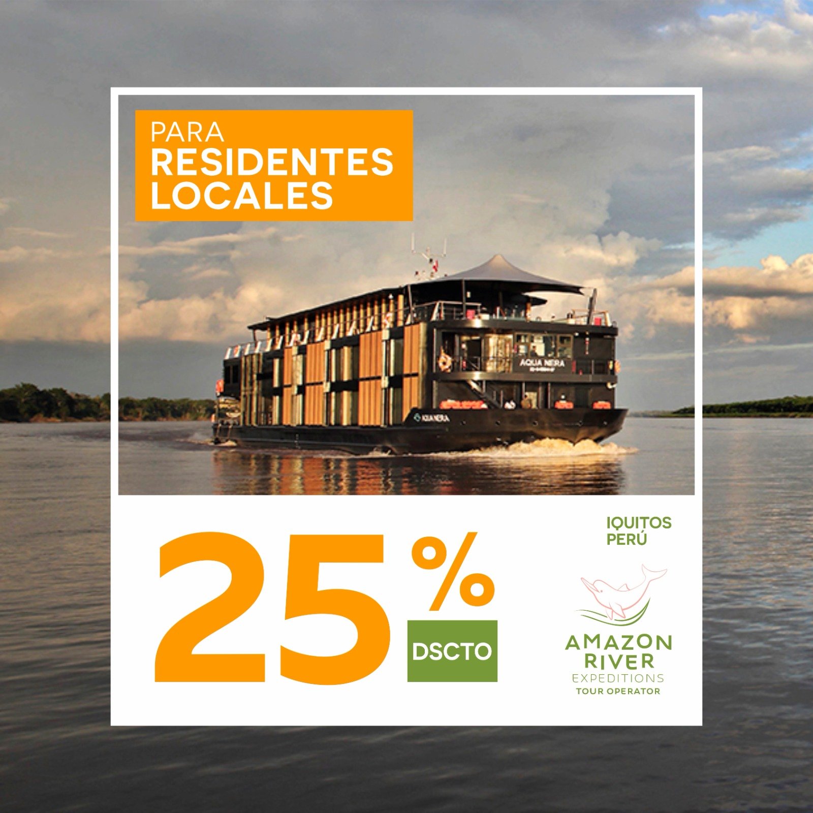 Los peruanos y residentes ahora tienen un 25% de descuento de la tarifa total en su viaje por el Río Amazonas abordo de ARIA AMAZON y AQUA NERA . ¡No lo deje pasar!