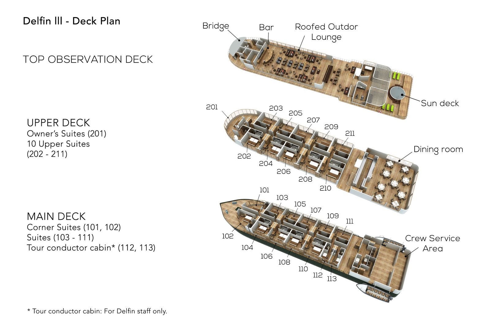 En la primera cubierta hay 8 suites con ventanas panorámicas desde el piso hasta el techo, así como 2 espaciosas suites en la esquina que dan al frente del barco. La segunda cubierta consta de 10 suites superiores y la más grande de todas, la owner suite y en la cubierta superior cuenta con hermosas salas de estar interiores y exteriores, una terraza con piscina, un spa y gimnasio y, por supuesto, el bar.